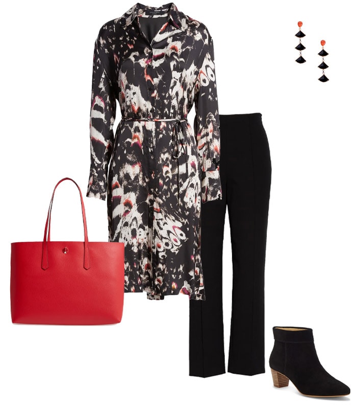 Chemise AllSaints, Pantalon Vince, Bottines Lucky, Fourre-tout Kate Spade New York, Boucles d’oreilles Nakamol