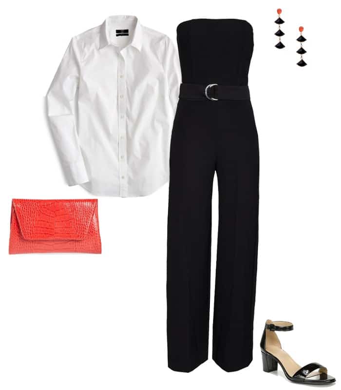 Combinaison ceinturée Chelsea28, Chemise J.Crew, Pochette Nordstrom, Sandales Naturalizer, Boucles d’oreilles Nakamol