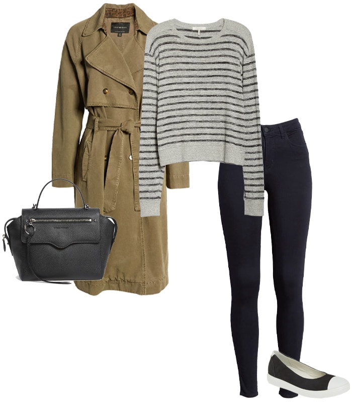Trench Lucky Brand, Pull Rag & Bone, Jean skinny L’AGENCE, Ballerines ECCO, Sacoche Rebecca Minkoff