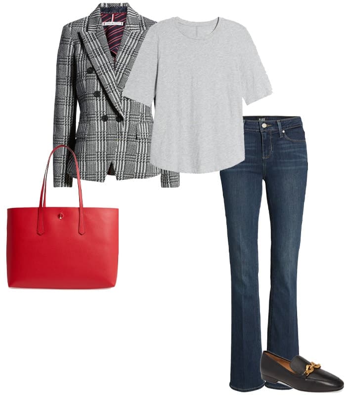 Veste pied de poule Tommy Hilfiger, T-shirt Eileen Fisher, Jean bootcut PAIGE, Mocassins Tory Burch, fourre-tout Kate Spade New York